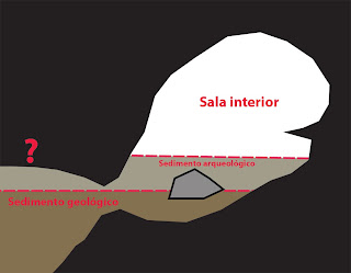 From the standpoint of cave exploration, it is important to evaluate the real meaning of this "sink", where it seems to have penetrated some of the archaeological sediments, indicating the continuity of the cave in that direction. This hypothesis is reinforced by the very topography of the stalagmite plate that formed over sediments already sloping in direction of that "sink" and that have been subsequently dragged into it.