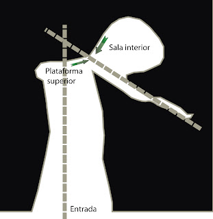 Not forgetting the physical structure of the cave that serves as a natural staircase, between the entrance and the upper deck, recalling some examples of altars with stairs, like in Cadiz. In the cave, we can actually define 3 levels, eventually used in ritual terms, according to the access to light: openly iluminated in the largest part of the cave, close to the entrance (the logically most puiblic part of the santuary); twiglight zone, on the uppermost part of the space, where the public cereminies would probably take place; dark inside the Inner Room, supposedly used for more restricted purposes.